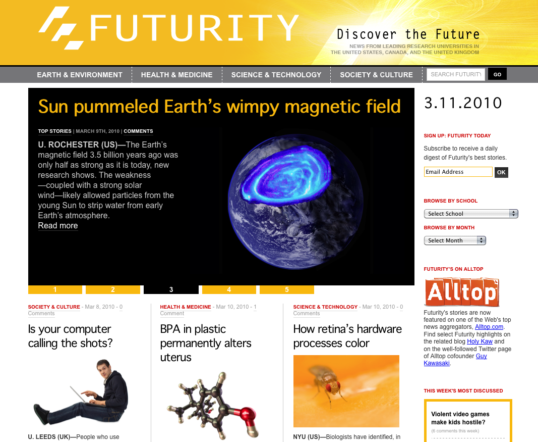 Futurity.org , démarré en septembre 2009 par les universités américaines de Duke, Stanford et Rochester, offre la possibilité aux universités de recherche de ne plus être dépendant des médias pour faire connaître les résultats de leurs recherches.