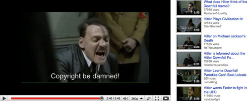 Lundi 19 avril, le site TechCrunch révélait que la plus célèbre des sources de parodies en ligne, l’accès de rage d’Adolf Hitler dans La Chute d’Oliver Hirschbiegel, faisait l’objet d’une demande de retrait systématique de la part du distributeur Constantin Film. Dès le lendemain, cette information se voyait à son tour détournée et moquée sur la partition de l’offensive Steiner. On aurait pu apprécier la réactivité du web et sa réjouissante capacité à transformer l’arroseur en arrosé. Mais il n’a fallu que quelques heures aux robots de YouTube pour bloquer l’accès à ces pastiches.
