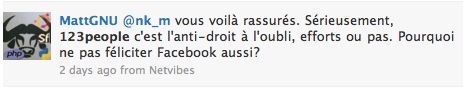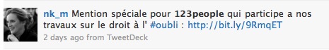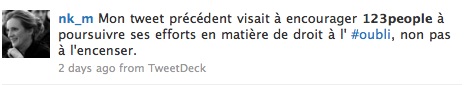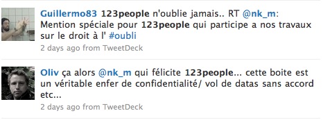 Captures d’écran d’un échange de tweets entre Nathalie Kosciusko-Morizet, maire de Longjumeau, Secrétaire d’État à la Prospective et au Numérique, numéro 2 de l’UMP et initiatrice d’un débat sur le “droit à l’oubli”, et un certain nombre d’internautes pour qui 123people n’est précisément pas tout à fait le modèle à suivre pour ce qui est du “droit à l’oubli”.