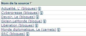 Des blogs ? des sites web ? Mais lesquels ? Ben il suffit d’aller voir sur le petit moteur de recherche et de filtrer par langue (français) et par type de source : blogue. On obtient… 7 résultats !