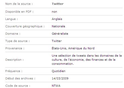 Si l’on creuse encore un peu dans les sources, on s’aperçoit qu’il y a aussi une catégorie “twitter”. On n’y trouve non pas une liste de comptes, mais une fiche descriptive relative à twitter :