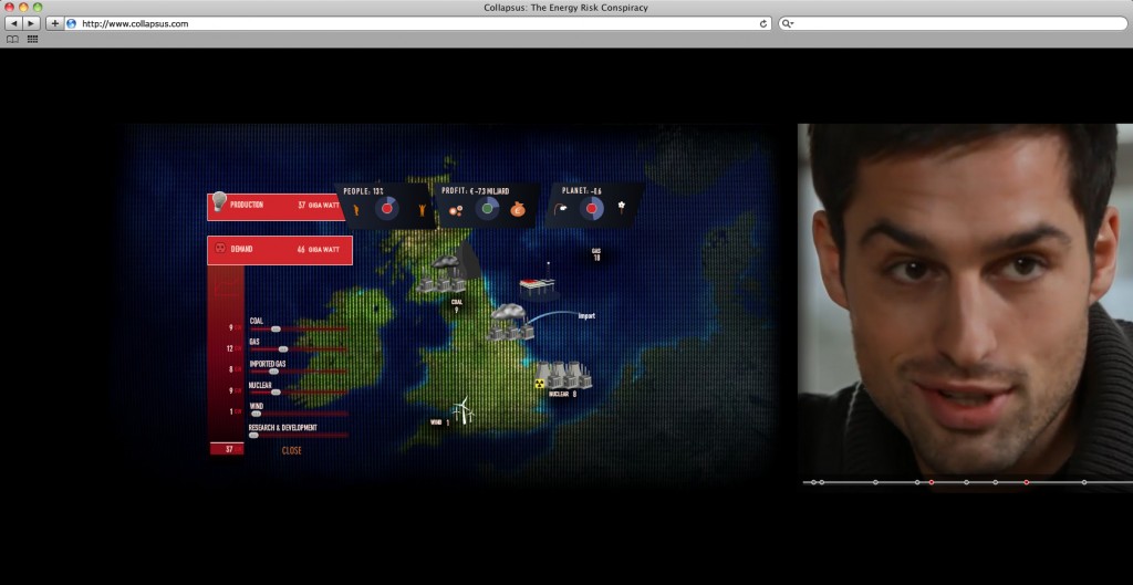 À l’origine, Collapsus était un documentaire pour la télévision néerlandaise VPRO, sur la transition à venir des combustibles fossiles à des sources d’énergie alternatives. Les producteurs voulaient attirer un public plus jeune, avec les mêmes idées et les mêmes thèmes. Ils ont demandé à Submarine Channel de plancher sur quelque chose de neuf et d’expérimental. Un méta-scénario a alors été conçu, sur la base des travaux pour le film. Puis un script interactif a été écrit, comprenant aussi bien le récit fictif que les mécanismes interactifs. On a ensuite mis tout ça ensemble, et on a divisé le travail en équipe : fiction, documentaire, interactivité.