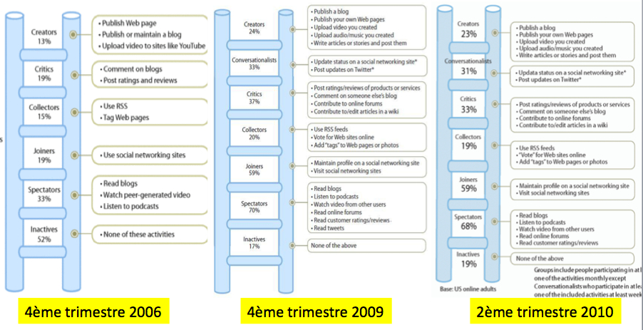 - la part des inactifs, dominante aux commencements du web 2.0, s’est drastiquement réduite pour se stabiliser et ne plus concerner qu’environ 7% des internautes.