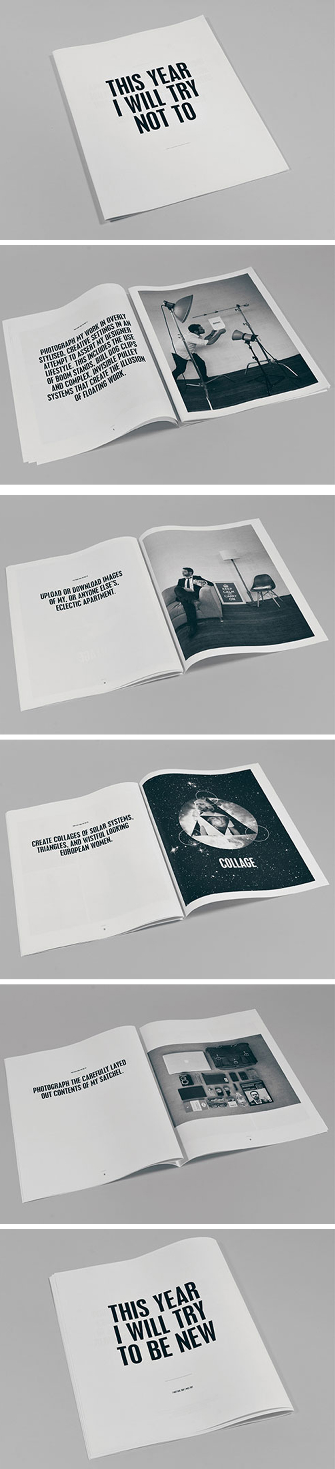 “This year, I will try not to”, ou en français, “Cette année, j’essayerai de ne pas…” est un petit recueil de bonnes résolutions destiné aux graphistes :-) En effet, beaucoup de designers graphiques sont séduits par les tendances du design. Elles sont faciles à s’approprier, et encore plus facile à imiter. Le défi consiste donc à innover, tout simplement :-) Cet ouvrage a donc pour but d’identifier et de documenter les tendances les plus communes et d’essayer de les éviter :-) Un travail intelligent et critique signé Scott Elliott et Christopher Doyle.