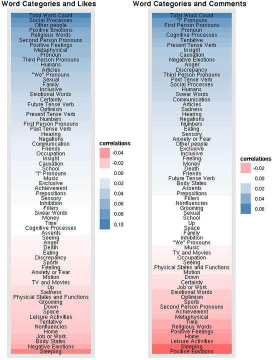 Facebook a aussi fait étudier les statuts qui appellent le commentaire et ceux qui entraînent la recommandation. On constate là un usage complémentaire des deux fonctions: les mots classés positifs provoquent plutôt des «likes» et les négatifs des commentaires. De même, les messages longs et rédigés (notamment l’utilisation de pronoms) appellent de nombreuses interactions quand les statuts plus personnels éteignent la discussion (typiquement: les messages à tonalité religieuse obtiennent des recommandations mais pas de commentaires et ceux qui relatent la qualité du sommeil font fuir les deux).
