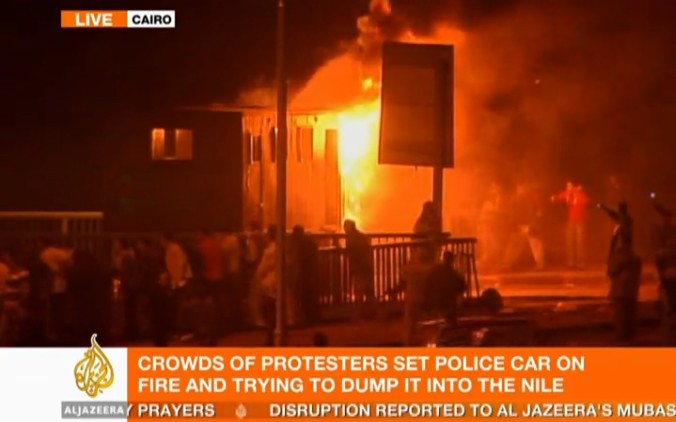 [17h17] Les manifestants font brûler un camion de police sur un pont, qu’ils avaient d’abord tenté de renverser dans le fleuve, au Caire (Al-Jazeera).