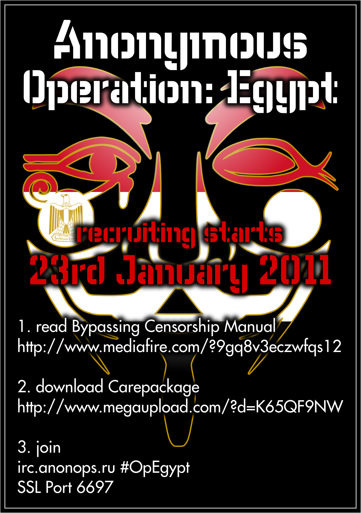 Sur un EtherPad dédié, les Anonymous suggèrent aux Egyptiens d’éviter d’utiliser le web (plutôt malmené ces dernières heures) pour communiquer entre eux. Ils vont même plus loin, et en appellent à des méthodes d’agit-prop: