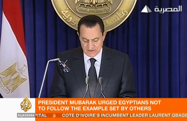 Dans un discours télévisé très attendu, le président égyptien Moubarak a annoncé qu’il ne se présentera pas aux prochaines élections, mais qu’il fera honneur à ses responsabilités jusqu’à la fin de son mandat.