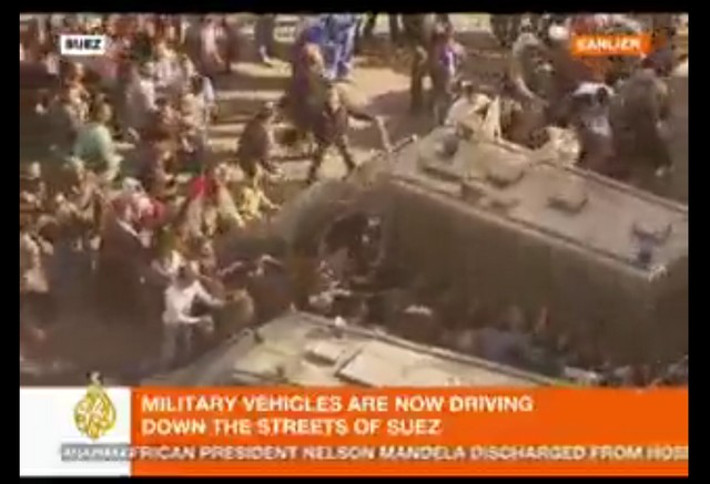 [18h46] Une image des tanks égyptiens, salués par les manifestants. (Al-Jazeera)