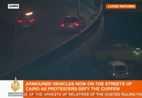 Alors que les forces militaires auraient fait leur entrée au Caire (visiblement du côté des manifestants), la situation devient confuse. Alors que le gouvernement égyptien a imposé un couvre-feu à partir de 18h, Al-Jazeera montre des images de policiers jetant des pierres puis s’arrêtant pour laisser les manifestants prier spontanément devant eux.
