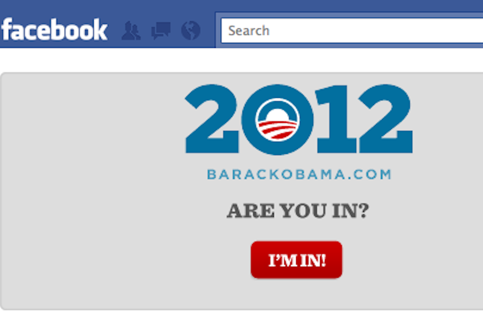 Prenez l’application Facebook “Are you in” qui faisait partie de la campagne d’Obama lancée récemment. Apparemment, c’est un outil soigné qui non seulement permet aux supporters d’Obama de déclarer leur soutien à la réélection du président, mais présente aussi immédiatement une liste de leurs amis également engagés et les invite à joindre facilement les autres. Mais sous la surface se joue quelque chose d’encore plus puissant. La première fois que vous utilisez l’application, elle demande votre permission d’ajouter les informations vous concernant (comme votre nom, vos photos, genre, réseaux, votre liste d’amis, et “n’importe quelle autre information” laissée ouverte sur Facebook). Elle demande également votre permission de lister votre date d’anniversaire, votre ville actuelle, et la possibilité de vous joindre par mail et à poster sur votre mur. (Certaines de ces fonctionnalités peuvent être limitées, mais la plupart sont requises à l’utilisation de l’application).