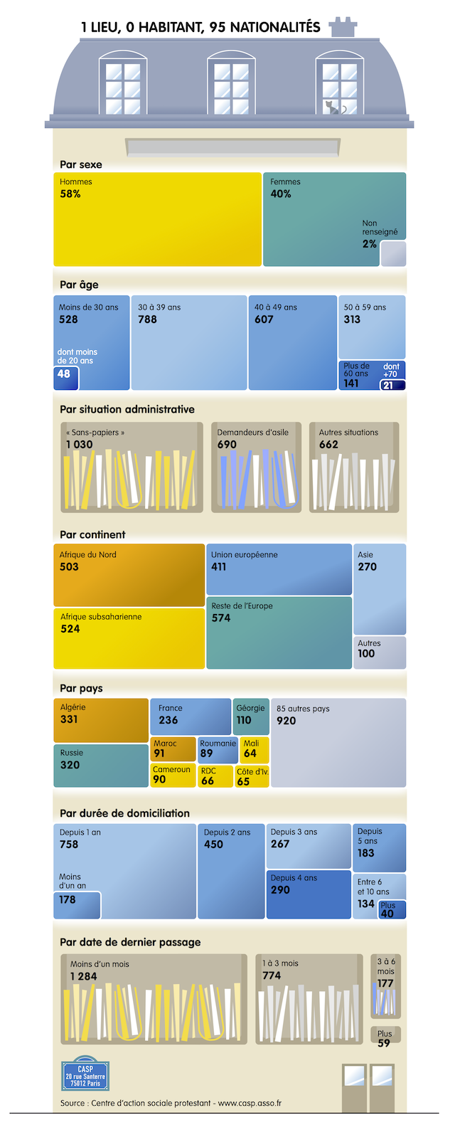 Le Centre d'Action Social Protestant propose aux personnes sans domicile stable une adresse administrative. Nous avons synthétisé les données relatives à leurs 2.500 bénéficiaires.
