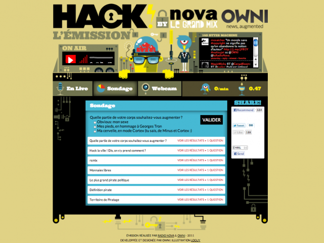 Minuit sonne sous la verrière de Radio Nova… Let’s go Hack IRL ! In-Real-Life ! Le Hacking citoyen, Geoffrey Dorne en a fait son projet de fin d’études à l’ENSAD. Chercheur en design et collaborateur, entre autre, d’Owni.fr avec sa chronique Vendredi c’est graphism, il explique comment le citoyen peut aller “à l’encontre de la surveillance accrue et pouvoir ainsi, recouvrer certaines libertés et certains droits menacés par l’État.” Le contenu de la box ? Découvrez-le sur Graphism.fr !