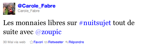 Economie et pirateries… il est déjà 22h00. Zoupic prend une grande respiration et se lance sur le thème “monnaies libres, libres des monnaies”. Comment augmenter le partage et la répartition des richesses ? Après un retour sur l’histoire des monnaies, on passe en revue les alternatives :  le bekshare à San Fransisco, la luciole, le Sol violette, le WIR, etc. Et sur le net, les bitcoins, ripple et autres superfluid. Avant le brainstorm, Jean-Marc Manach nous régale d’une chronique sur les hackers et la DST.