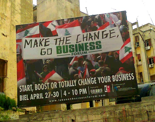 Mais au moins, dans l’exemple américain, la récupération a-t-elle eu lieu a posteriori. On peut être ainsi quelque peu choqué à découvrir, dans le centre de Beyrouth en avril, alors que le printemps arabe n’était pas si loin, cette publicité qui associe la participation à un business forum à une manifestation de rue…