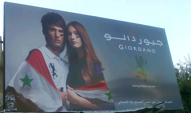 Mais on est franchement atterré quand on découvre dans le centre de la capitale de la Syrie cette publicité qui fait sans doute allusion aux codes vestimentaires des supporters de foot mais qui fait surtout irrésistiblement penser aux manifestants pro-régimes, alors que les « événements » (comme on disait en métropole autrefois lorsqu’il s’agissait de l’Algérie) ont vraisemblablement déjà entraîné la mort de près de deux mille personnes…