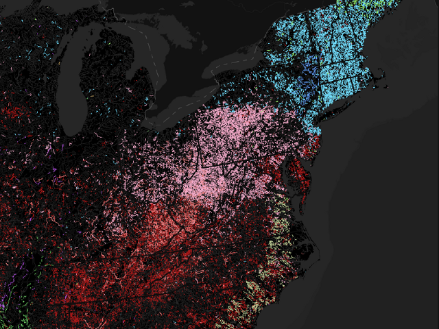 Dans le même ordre d’idée (un peu #oldlink, et un peu #dark), une pimpante cartographie des États-Unis s’affiche sous le prisme de ses dénominations géographiques génériques, ou toponymes. En se basant sur les données ouvertes (voilà, ça sert aussi à ça, l’open data) du bureau d’inspection géologique étasunien, Derek Watkins peint une carte comme un tableau du pointilliste Georges Seurat, en couleurs inversées sur fond de considérations linguistiques. Où sont les ruisseaux, les marécages, les marais, les bourbiers, les rios et les arroyos qui se retrouvent par centaines de milliers dans le nom des bouts de terres humides et spongieuses, qui, mises bout à bout, forment les États-Unis d’Amérique ? Preuve par l’image : rarement aux mêmes endroits. Et il n’est point besoin d’être anglophone ni géologue pour le comprendre.