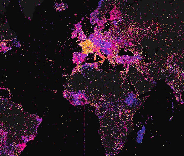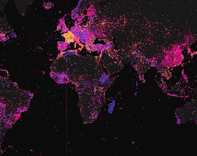 Cette réalisation, “Mapping Wikipédia” géolocalise, au moyen de points de couleurs sur fond noir, les articles produits pour Wikipédia selon différents critères : nombre d’auteurs, compte de mots, densité, langue, date de création, nombre d’images, nombres de liens, longueur de la section, éditions anonymes.