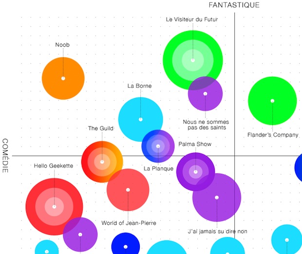 Avec cette infographie interactive, le collectif Orange fait d’une pierre deux coups : aider à qualifier les multiples web séries qui ont fait leur apparition sur la toile ces dernières années en les positionnant sur un double axe (comédie/drame – fantastique/réaliste) et en leur attribuant un code couleur tranches de vie, critique sociale, thriller) mais aussi permettre de les découvrir en insérant des extraits d’épisodes au clic des bulles.
