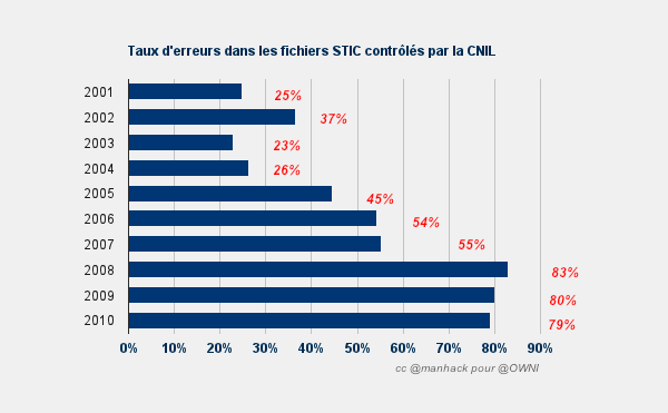 Tous les ans, depuis 2001, la CNIL publie ainsi dans son rapport annuel d’activité le nombre de fiches “rigoureusement exactes” qu’elle a vérifié ou qui, a contrario, ont du être modifiées, voire supprimées. En 2001, le taux d’erreurs était de 25%. En 2010, il était de 79%, après un taux record de 83% d’erreurs en 2008 :