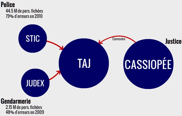 Afin de nettoyer le STIC de toutes ses erreurs, le ministère de l’Intérieur a donc décidé d’interconnecter le nouveau fichier TAJ avec Cassiopée (pour “Chaine Applicative Supportant le Système d’Information Oriente Procédure pénale Et Enfants“), le fichier du ministère de la Justice utilisé pour enregistrer les informations relatives aux plaintes et dénonciations reçues par les magistrats.