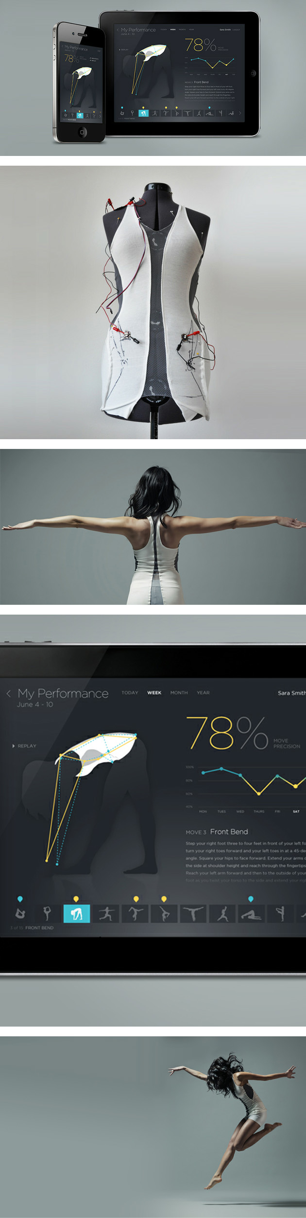 Le vêtement comprend quatre capteurs d’étirement et de pliage situés à l’avant, à l’arrière et sur les côtés. Ensemble, ils informent de la position de votre corps et du mouvement musculaire afin de déterminer si ils sont corrects. Le tout est relié à un téléphone mobile ou une tablette et vous permet d’évaluer, de gérer et de personnaliser votre expérience physique.