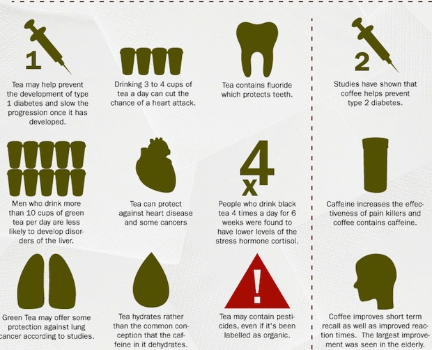 La quatrième “The Health Benefits of Coffee vs Tea” témoigne d’un travail plus riche, tant au niveau design que données. On y apprend par exemple que la vente annuelle de thé rapporte deux fois que celle du café, et les avantages/inconvénients de chaque breuvage : le thé contient du fluor qui protège les dents mais également du tanin, qui réduit les capacités d’absorption de fer de notre organisme, favorisant ainsi l’anémie. A l’inverse, le café aide à prévenir le diabète de type 2 mais réduit l’afflux du sang au cœur. Il en reste 18 à découvrir…