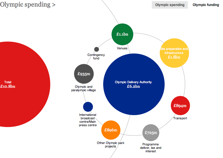 Sous la forme d’un système solaire, les £10.8 milliards (€12.8 milliards) dépensés dans la compétition par le comité olympique (Locog), les autorités publiques et l’Olympic Delivery Authority, de même que les £11.3 milliards (€14 milliards) de financement sont décortiqués. Chaque bulle a une couleur propre à l’autorité concernée.
