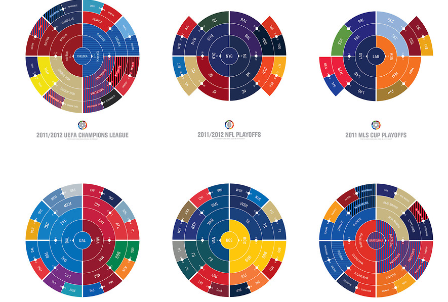 Commençons par un coup d’Å“il sur les championnats des années passées. Hyperakt revient sur les matchs de l’UEFA, de la NBA et autres ligues sous forme de cibles. Chaque “secteur” de la cible représente une équipe à laquelle une couleur est attribuée. Un petit losange blanc marque les affrontements entre les clubs. L’équipe gagnante progresse ensuite vers le centre de la cible.