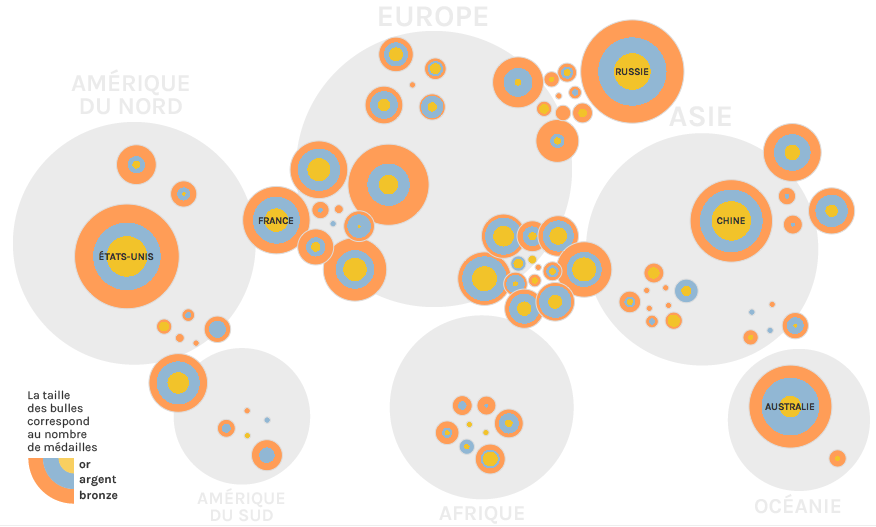 On enchaîne avec une visualisation interactive des médailles remportées lors de chaque Jeux Olympiques depuis 1896. Cette infographie, qui rappelle des cellules observées sous un microscope, s’organise autour des pays et de la couleur des médailles. Des pictogrammes colorés permettent également d’obtenir le classement par discipline sportive.