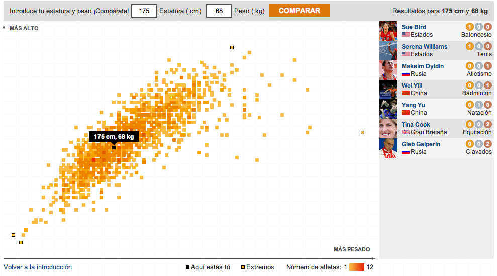 Il vous suffit donc d’entrer votre taille et votre poids pour voir apparaître les sportifs dont les morphologies sont similaires à la vôtre. Un nuage de carrés oranges vous permet de découvrir tous les athlètes sur des axes reprenant leurs mesures.