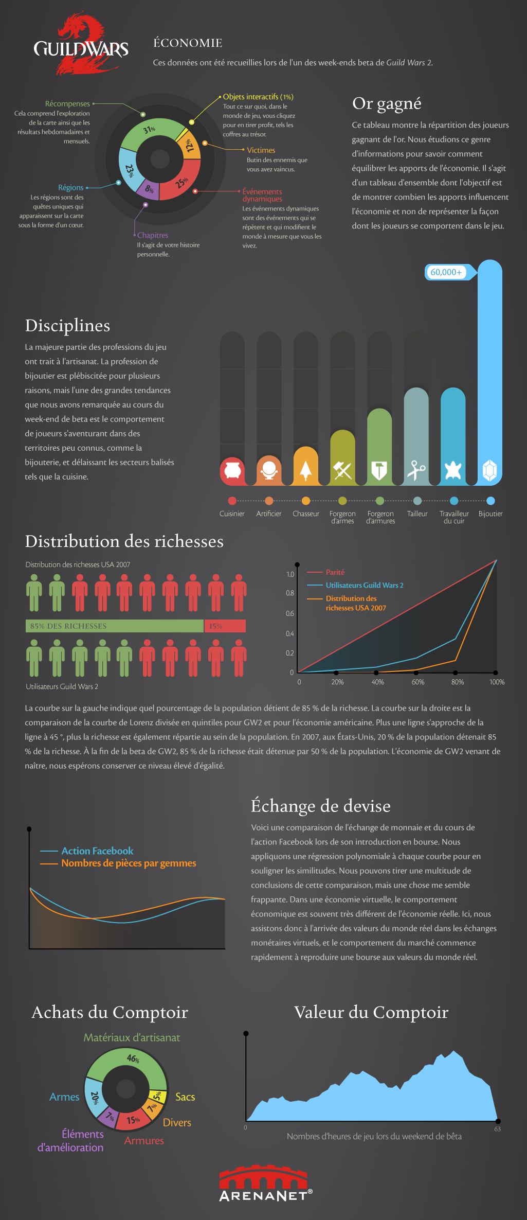 Avec plus de deux millions de joueurs, la 2e mouture du MMORPG Guild Wars, concurrent de World of Warcraft, est une mine de données. En attendant l'Open Data, son développeur publie au compte-goutte moult graphiques et statistiques pour le plus grand plaisir de la communauté et des devs !