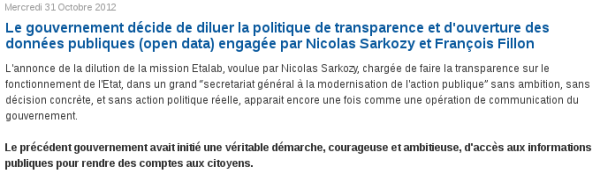 Cette semaine a également été marquée par le départ de Séverin Naudet, jusque-là directeur de la mission Etalab en charge de l’ouverture des données interministérielles et de la plateforme nationale data.gouv.fr. Départ accompagné de l’abrogation de la mission Etalab par le Décret 2012-1198 du 30 octobre 2012 portant création du secrétariat général pour la modernisation de l’action publique.